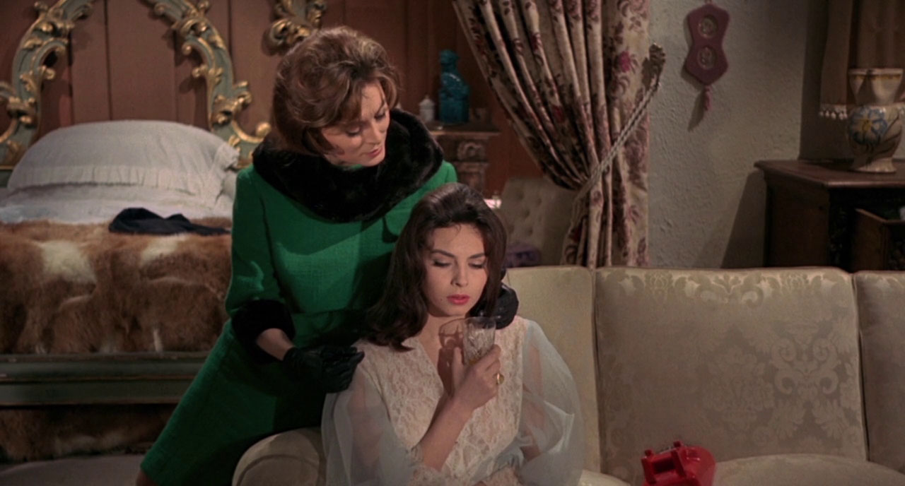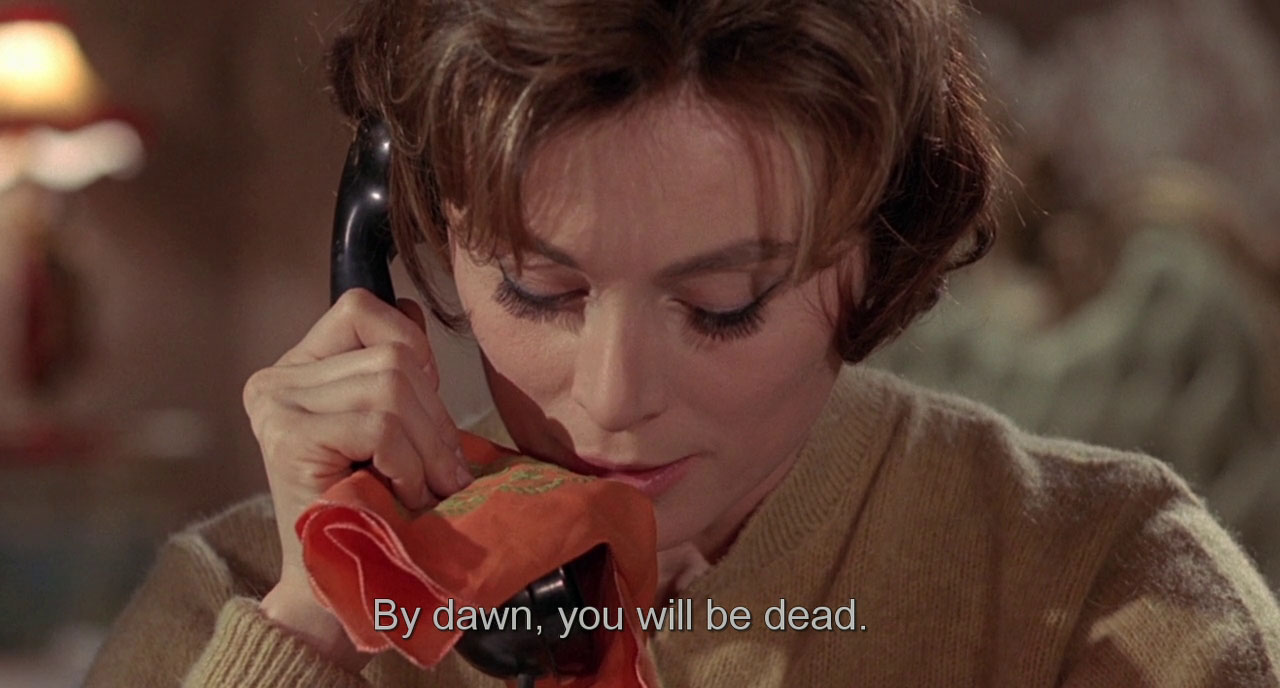 Pretty good suspense story, with your usual black-gloved Italian knife murderer. Rosy (Michele Mercier, friendly prostitute in Shoot The Piano Player) is being harassed by telephone, thinks her just-escaped-from-prison ex Frank is returning for revenge, so calls over her former friend Mary. But Mary was making the calls as a fun prank in order to get invited over. As she writes a letter explaining this, Rosy’s just-escaped-from-prison ex Frank arrives and strangles Mary, then he’s killed by a knife-wielding Rosy, who now has no more friends. Fun fact: if you speak into the phone through a folded handkerchief your voice sounds just like Frank’s.