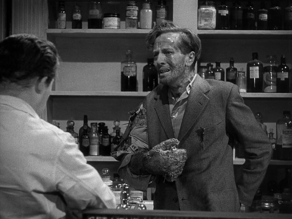 Dr. Quatermass (QUAY-tur-mass: Brian Donlevy, Preston Sturges’s McGinty, also in Curse of the Fly) is soon joined by another terrible character, Police Inspector Lomax (Jack Warner of The Ladykillers) investigating the disturbance and deaths, who describes himself as a “plain simple bible man” with “a routine mind,” not a phrase that goes well with the melting spaceman mystery. Meanwhile things get weirder with the surviving astronaut Carroon (Richard Wordsworth, great-great-grandson of the poet), who’s admitted to the hospital where he smashes a cactus and his hand absorbs it, becoming a giant cactus hand, with which he kills and liquifies hospital people. Carroon’s wife Judith (Margia Dean, small roles in the first couple Sam Fuller movies) decides to free her husband from the hospital with help from a doomed private investigator, setting Cactus-Carroon loose on the city.