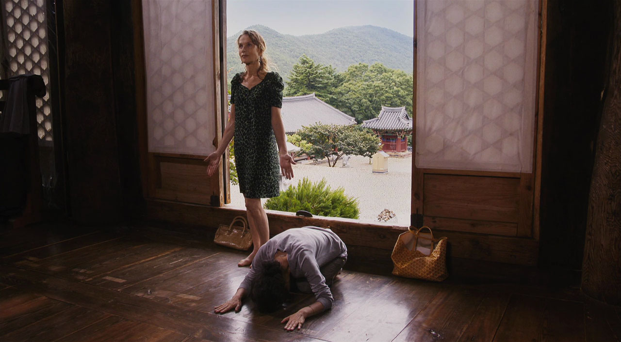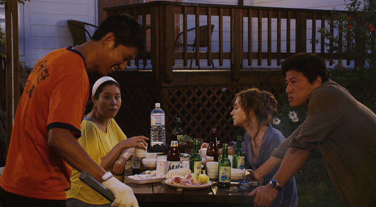 Certainly the MVP here is the lifeguard whose declarations (“I will protect you!!!”) and wonderfully dopey song are probably the closest to broad comedy I’ve seen from Hong so far. Huppert plays three different versions of a cipher (cold, needy, mourning) who all get men attracted to her no matter how she acts … Foreignness is certainly an interesting element; here Huppert’s various roles acting as the exotic figure as if a twist on the usual Western perspective of exotic women.