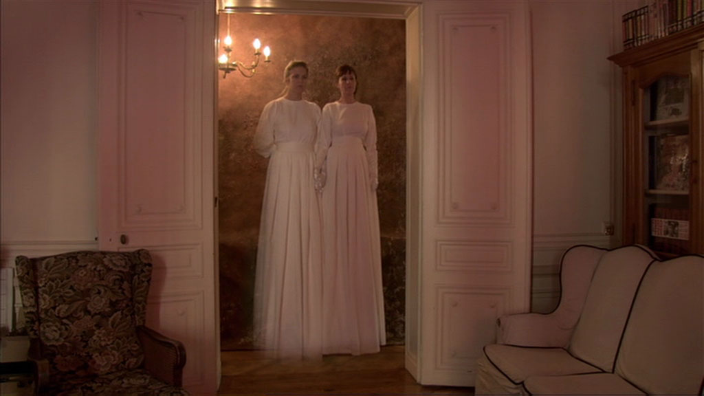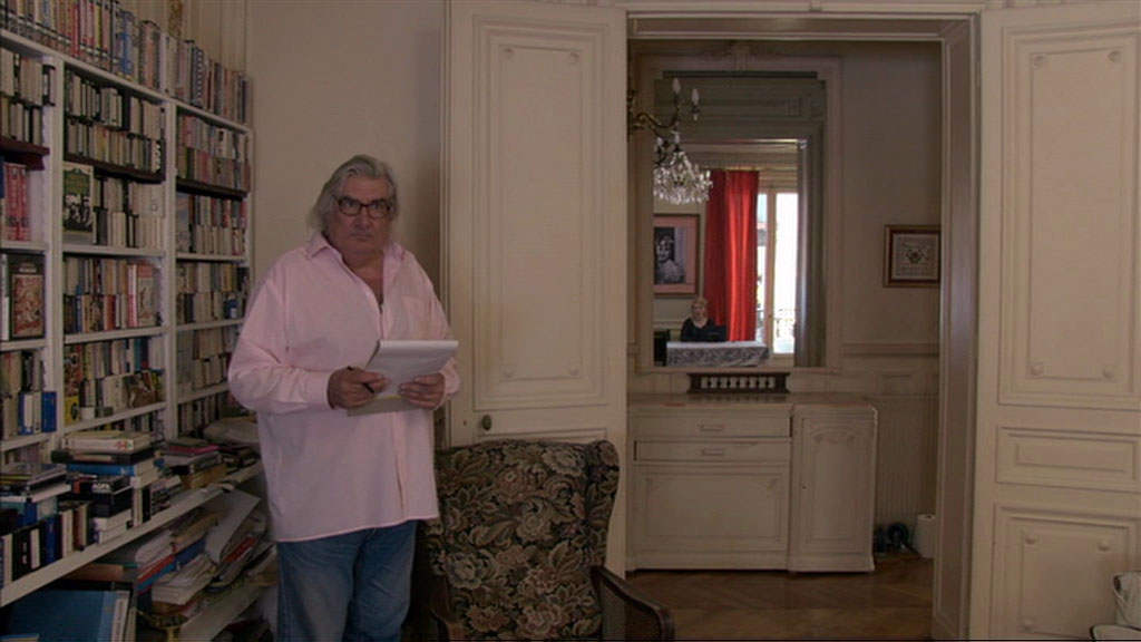 I liked the movie’s style, especially once the spirits appeared with charmingly simple ghost-costumes. The whole thing appears to have been shot on the cheap, with medium-res video and occasional mic problems – unless the DVD was just poorly produced. Set mostly in Michel’s apartment (the director’s own, per Cinema Scope), which is wall-to-wall media – books and albums and every classic-cinema DVD boxed set.