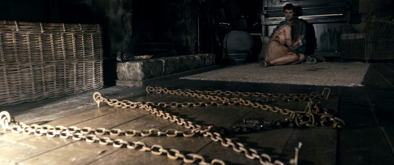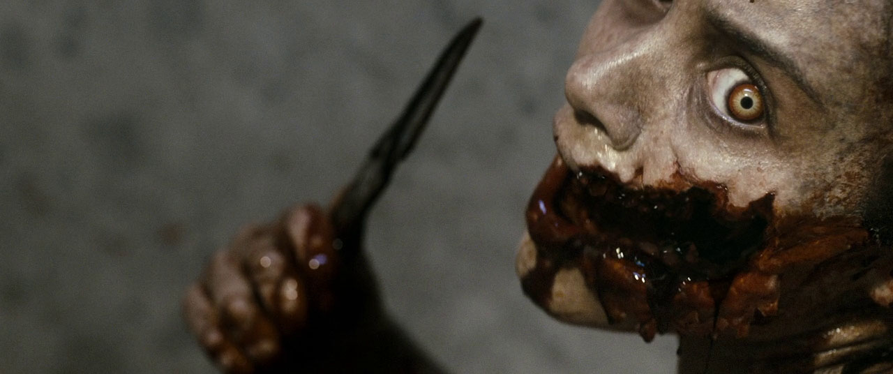 After the prologue we meet the doomed new gang. Eric (Lou Pucci of Spring and Southland Tales) is the glasses nerd who will discover the Book of the Dead and read the cursed passages. Olivia (Jessica Lucas of Cloverfield and Gotham) is a dark-haired nurse who is probably the first to die, though it’s hard to tell when anyone in this movie actually dies. City Boy David (Shiloh Fernandez of We Are Your Friends) is our lead cool dude who we assume will be the new Ash, but won’t be. His blonde girlfriend Natalie (Liz Blackmore of TV’s Vampire Diaries) gets bitten on the hand, tries to take care of the problem with the electric carving knife but still goes full demon.