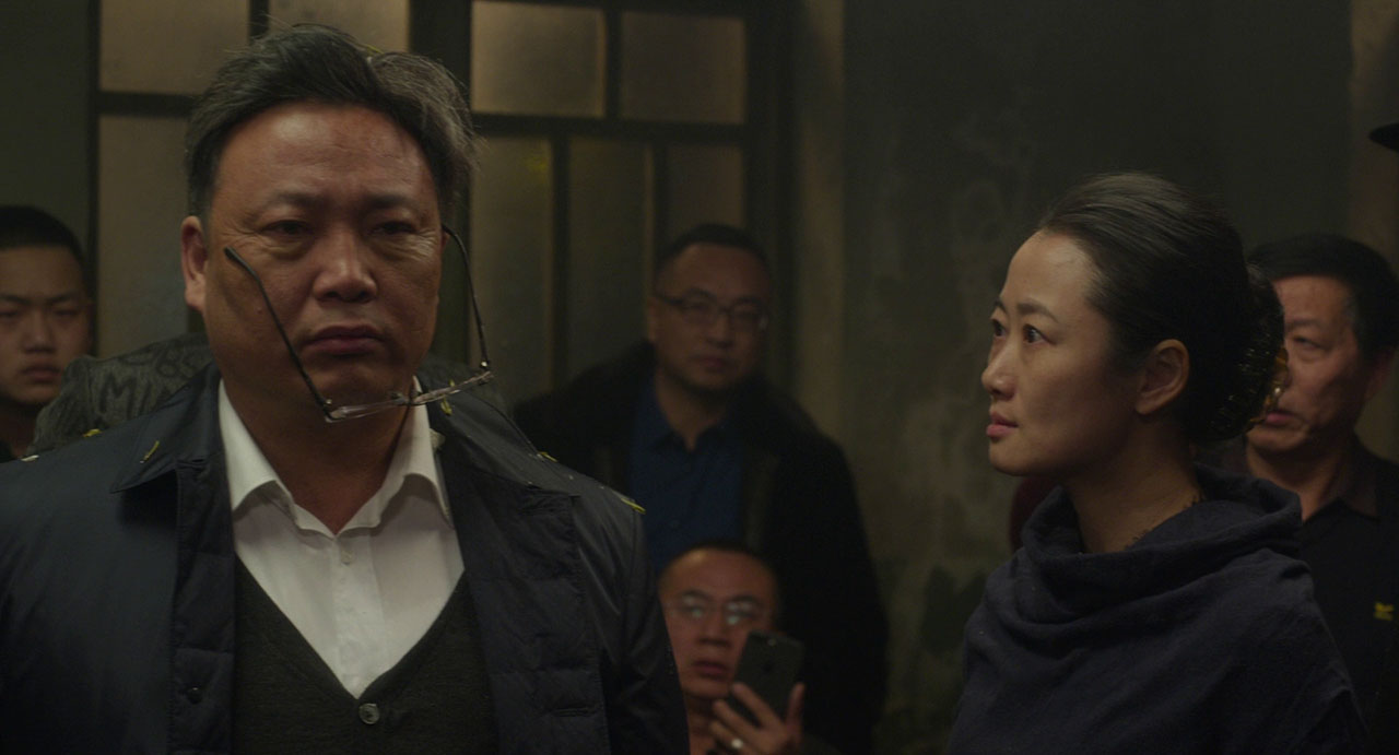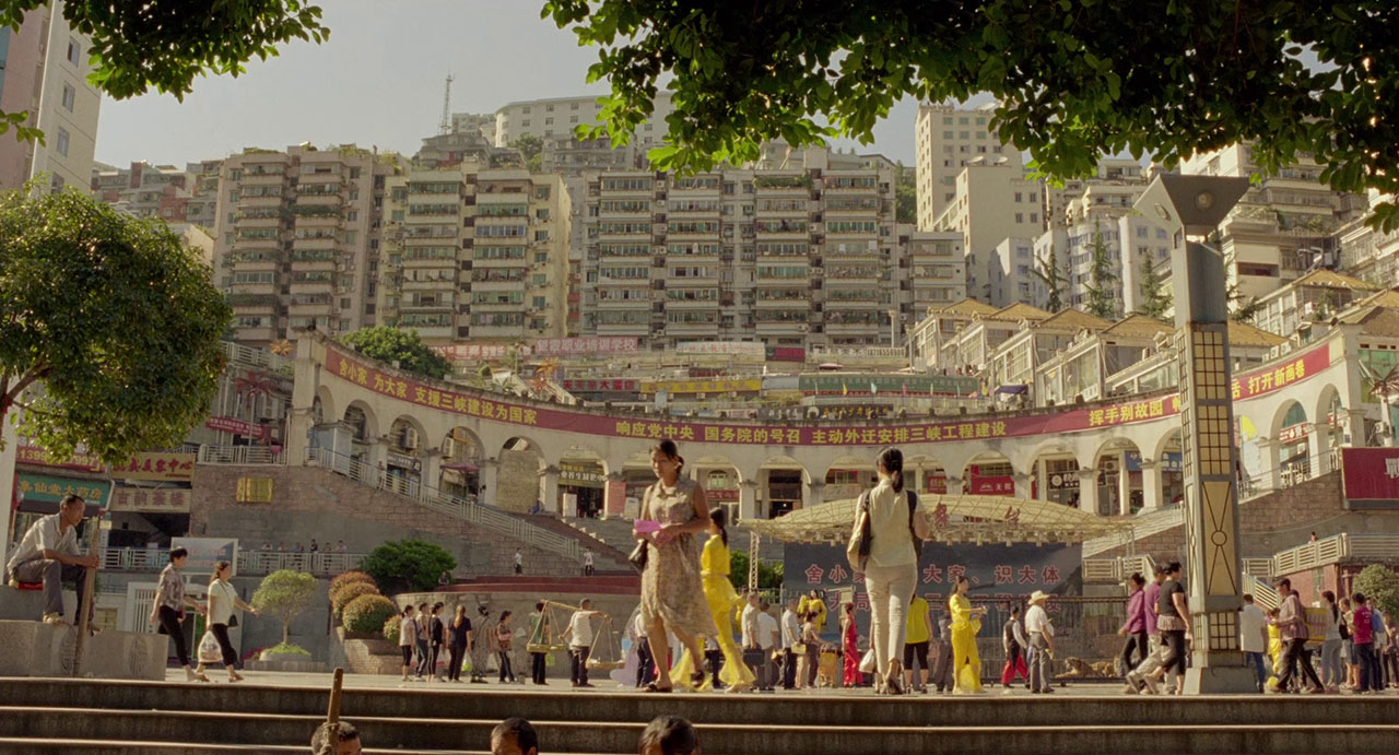 Alongside settings and structural conceits, many of these moods and registers seem to have wandered in from Jia’s other works: the rapid-fire martial-arts stylings of A Touch of Sin; the backdrop of Datong familiar from Unknown Pleasures; the three-part structure and repeated pop songs from Mountains May Depart; or the exquisite melancholy of 24 City, to name just a few, while the presence of Zhao Tao, whose wonderfully understated acting style reaches new heights here, equally conjures up all the other characters she’s played over the years. Of all the references to Jia’s cinematic past, the most explicit ones come from Still Life, as Qiao takes the same ferry down the Yangtze as in the previous film, wearing the same shade of yellow and carrying the same water bottle her spiritual cousin Shen Hong did all those years ago, with the same UFO later passing overhead. Despite these similarities, though, everything is different, as what used to be the present has now become the past. This change is visible both in Zhao Tao’s face and in one of the images shared by both films, a shot of a sign on the river bank showing the projected level of the reservoir. One points to a future yet to happen, the other to a past that only exists in memory, the original now buried under so much water.