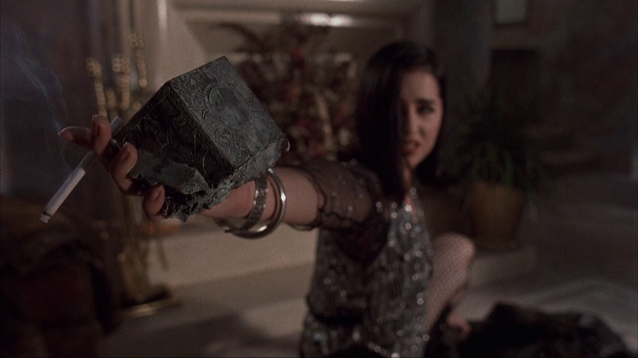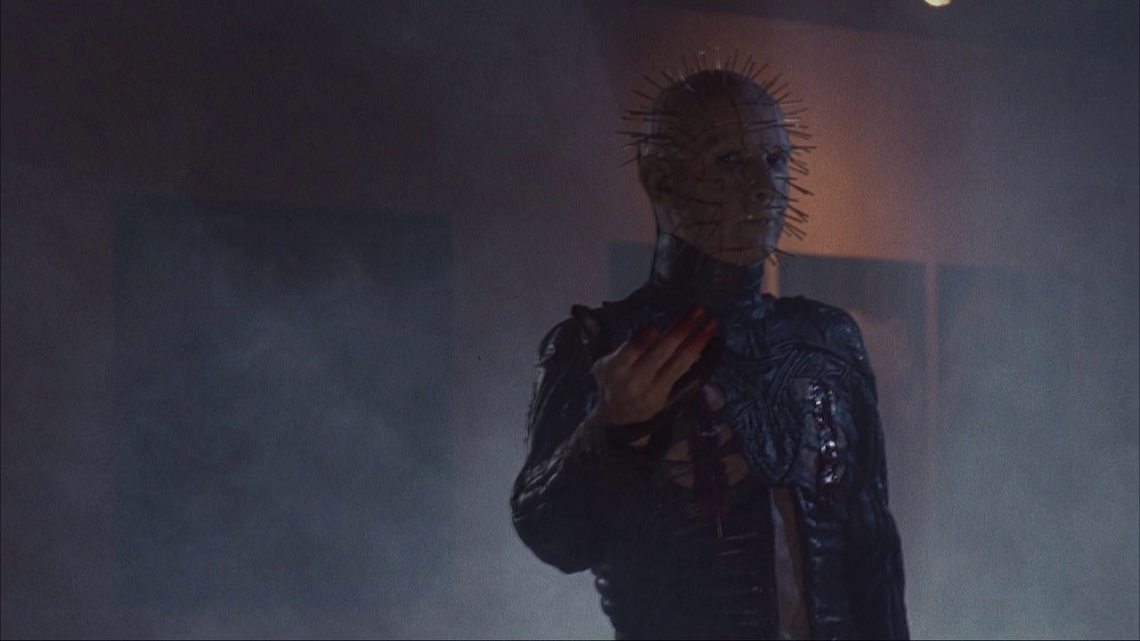 Fancy leather art collector buys the rotating pillar, which comes with an embedded hellbox and the hell priest himself. Failing young reporter Joey is ambulance-chasing with cameraman Doc when she witnesses a stray hellbox victim, picks up club girl Terri and starts investigating. Some promises and betrayals later, everyone’s a cenobite but Joey, who harnesses her dreams about her war-killed father to contact the pre-ceno Doug Bradley and summon him against his pinheaded self.