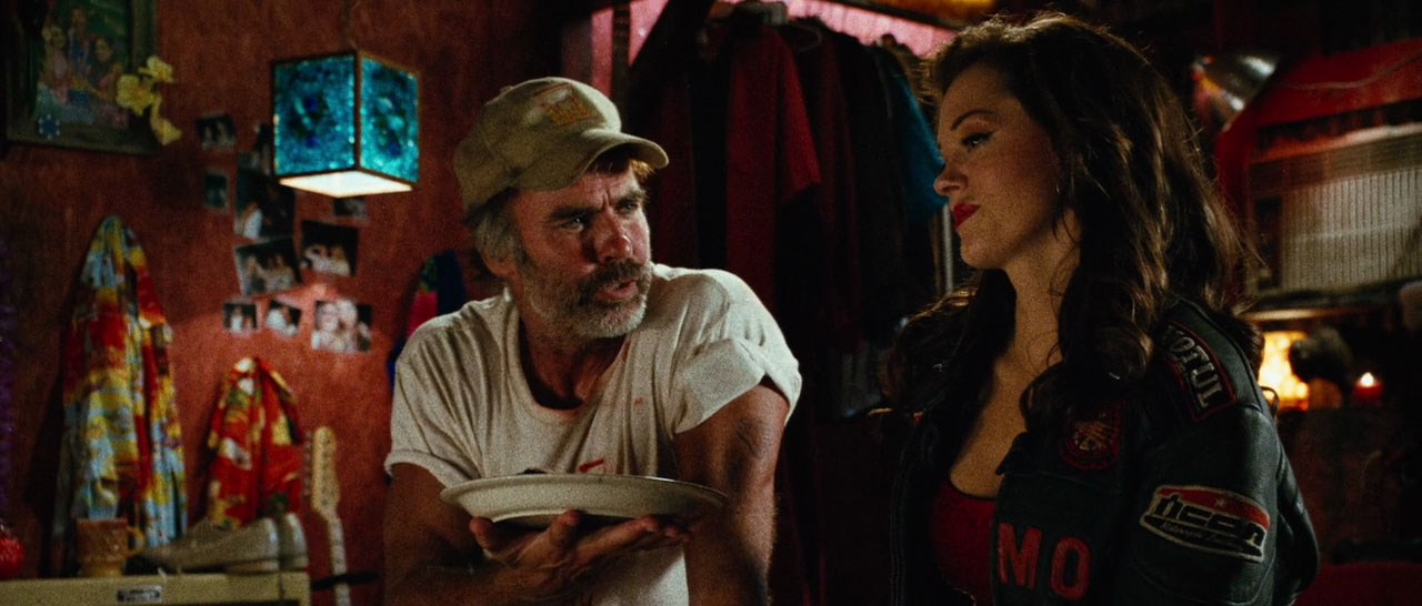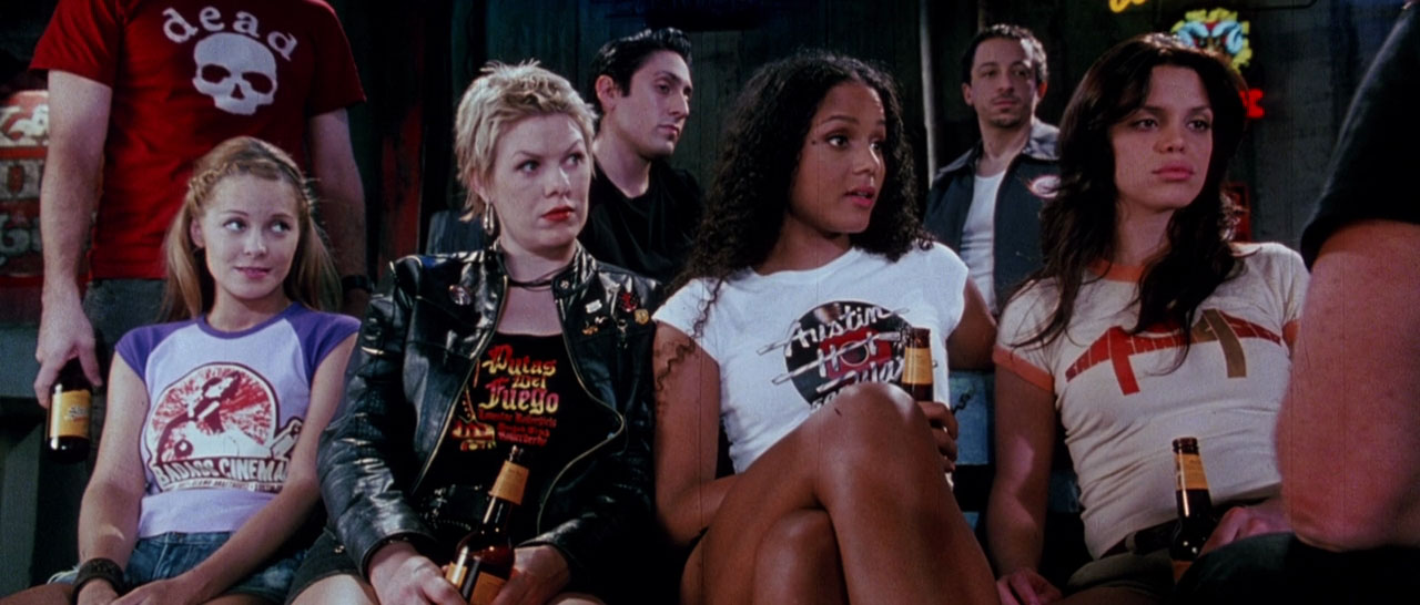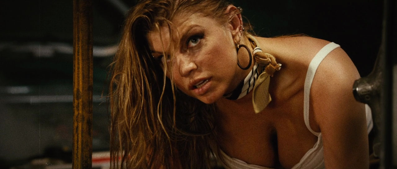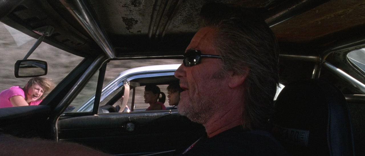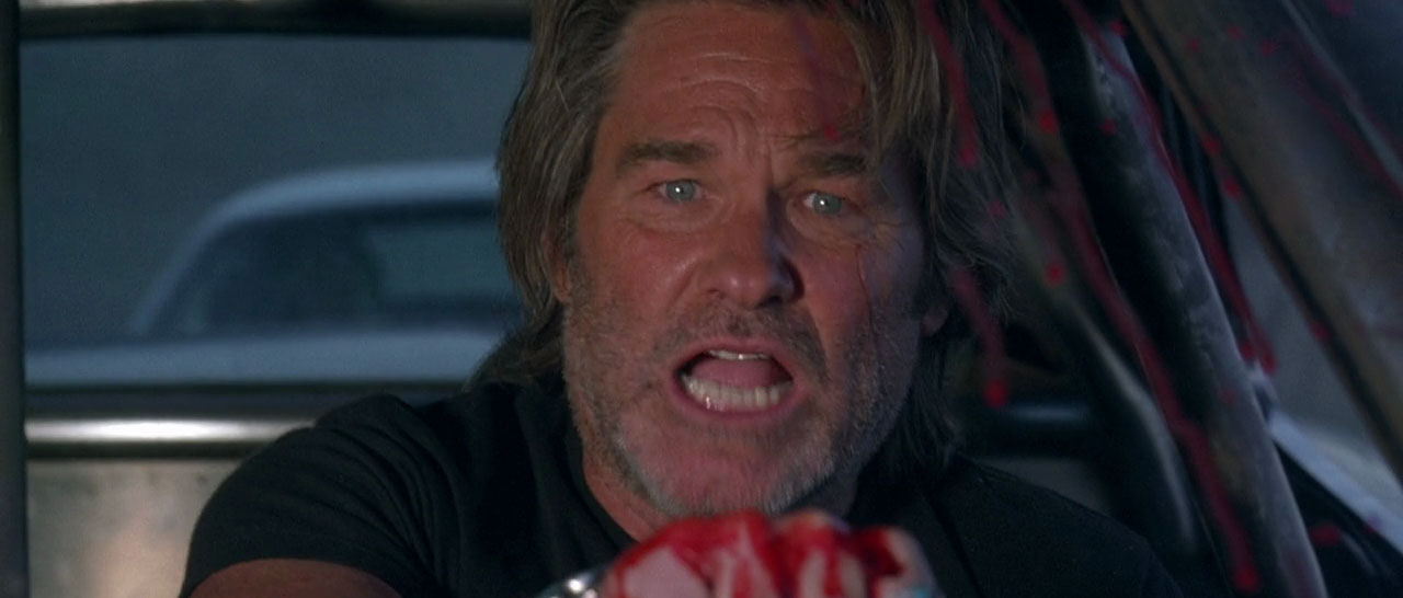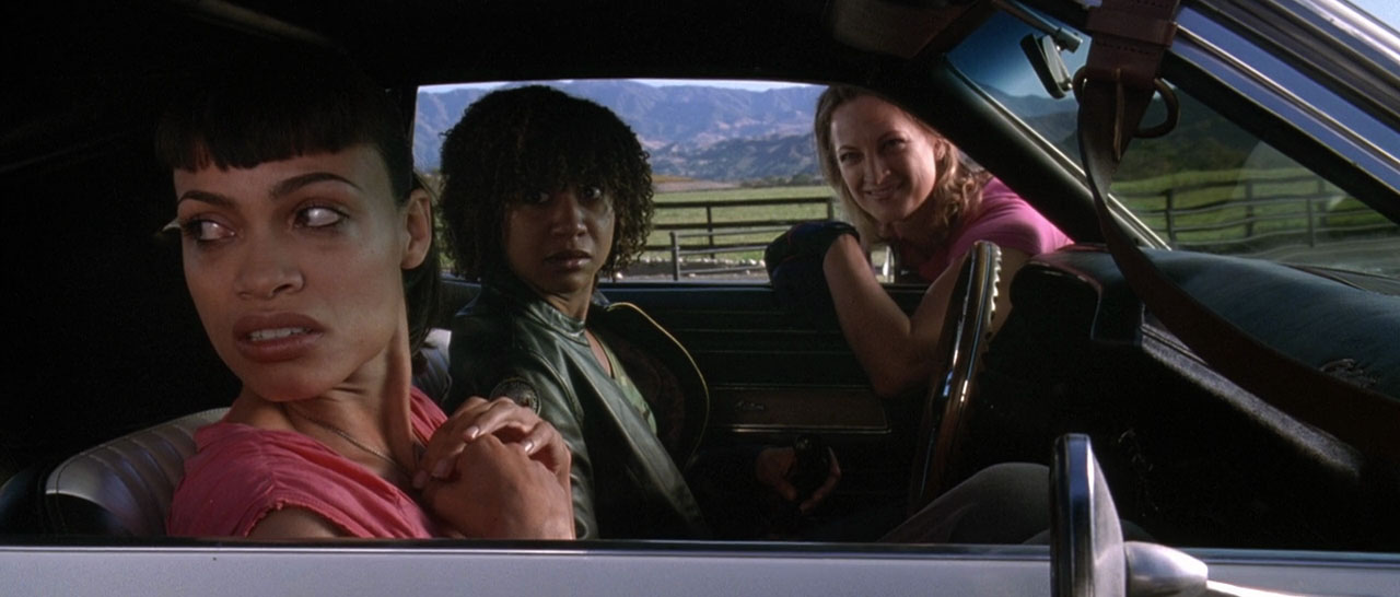 And about that car chase… next, a bunch more girls, and I can’t maintain much interest in the dialogue after he’s just Psycho’d his entire cast and expecting us to care about a whole new one, but here goes. This time they’re all in the film business: makeup artist Rosario Dawson, actress/model Lee (Mary Elizabeth Winstead, the girl with hair like this), and two stunt women, Kim (Tracie Thoms of Rent, Wonderfalls) and Zoë Bell (as herself, lately of The Hateful Eight). Lee is left with some redneck while the others test drive his Vanishing Point car. Kim drives while Zoë does poses on the hood, then suddenly Stuntman Mike starts running them off the road. Some of Zoë’s hood antics here are unbelievable, and the chase goes on nearly forever, then at a stop Kim shoots Mike, who drives off crying until they catch up and beat the shit out of him. Mike is one of my favorite QT creations, a super-tough, scar-faced pervert predator who becomes an absolute whiny little bitch when the tables are turned.
