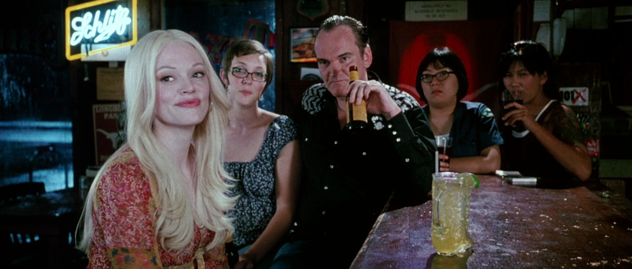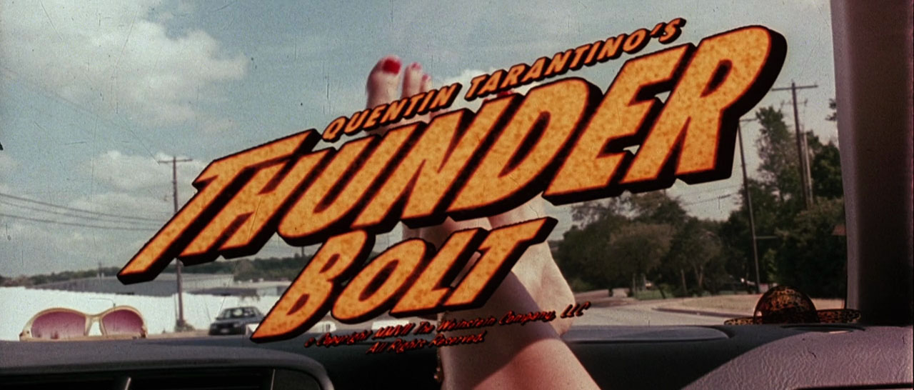 Opens with a great replacement-title gag, then there’s some editing humor and surface noise, and another “missing reel” right when something sexy’s about to happen, but then QT chills out with the self-reflexive filmmaking gags as his movie gets darker.