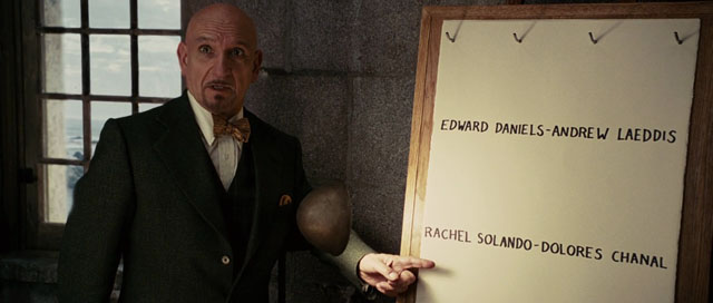 I don’t usually try to outthink a movie, to suppose what will happen next, but when I know in advance that it’s a twist-ending movie I’ve got no choice. What’s the twist ending? Will hallucinogenic drugs be involved? Who here is actually evil? Did the missing patient never exist? And if not, what is Leo supposed to be investigating? And so on, but it turned out to be the twist I’d guessed from the trailer, that Leo was mad all along. Seems his wife Michelle “Wendy & Lucy” Williams killed their kids, so he killed her and got committed, and now he wanders the asylum/island with a plastic gun pretending to solve crimes. Lead doctor Ben “Death and the Maiden” Kingsley assigns Leo’s own doctor Mark “Zodiac” Ruffalo as Leo’s “partner” and sets Leo loose for a couple days to run his “investigation” and see if he figures out the truth about himself.