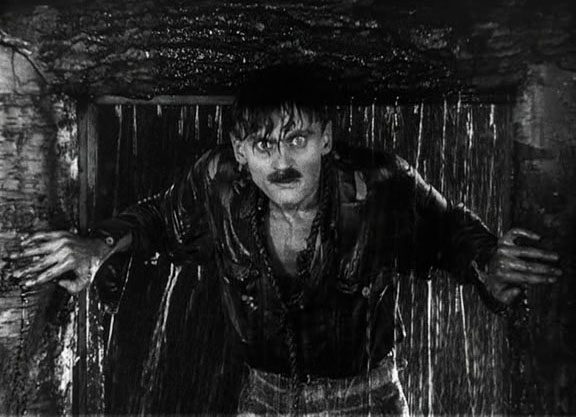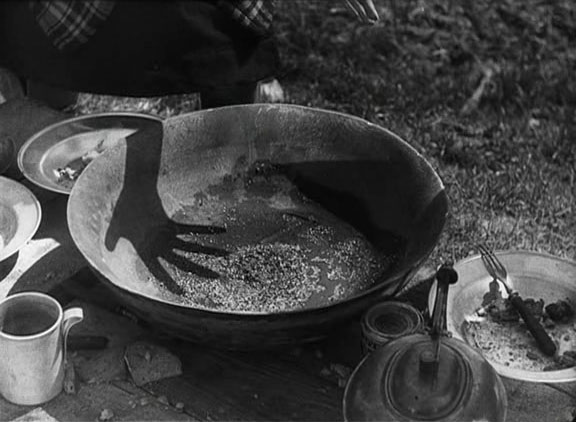 Now the surviving couple have to bury their partners (in a raging storm) then keep guard over Dennin for a whole season until the Law arrives, because Edith insists they not take revenge into their own hands. But Dennin is insane and destructive (he sets the bed on fire during a flood), and Edith seems to fall further into a religious fervor as they all suffer from cabin fever. This is the bulk of the movie’s runtime, the three of them stewing wordlessly in the cabin. It plays very much like a horror film. Kuleshov shows off his pioneering editing techniques, but also some great camerawork, like this post-Nosferatu hand shadow reaching for the gold.