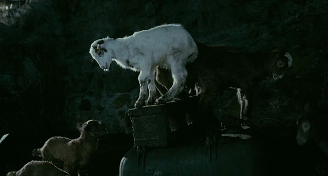 In order, as far as I remember it. Guy is on a steaming rock pile, slapping it with a shovel. A shepherd is taking his goats out to pasture, seems to have trouble walking home. That night he mixes some powder with water and drinks it before bed. Next day, collects snails in a pail, tries to fashion a lid so they won’t escape. Goes to church where he trades a bottle of milk to a woman for a packet of dust, which she has swept up from the floor. That day in the field he loses the packet, and is distressed about it when he gets home, goes to church but nobody answers. Next morning is the most impressive long-take I’ve seen all year. The camera is across the street from the man’s house, facing it, above the fenced-in pen where the goats are kept. A passion play is coming down the street, and some late-arriving centurions park across the street, propping their car tire with a rock. After the parade goes by, a boy lagging behind is threatened by the shepherd’s dog, distracts the dog by throwing rocks, dog grabs the one under the car, car rolls into the fence freeing all the goats. I can’t imagine wanting to coordinate a ten-minute shot with a cast of sixty townspeople in which the lead actors are a young child and a dog. Anyway, the shepherd is discovered dead, the goats rampaging through his house. A couple of new guys are taking care of the goats, but the movie doesn’t linger on them, takes the goats’ point of view for a while. We see a goat give birth (this is why Katy didn’t want to see the movie), the small goats play inside while the grown ones go to pasture, and finally when they’re old enough the small ones tag along – but one gets lost, presumably freezes to death under a tree. The tree is cut down, dragged into town and lifted up for some kind of festival, then taken down, chopped to bits and given to the coal man. He arranges the wood in a very orderly pile, covers it and sets alight, tamping it down from above to make coal. And that’s where we came in.