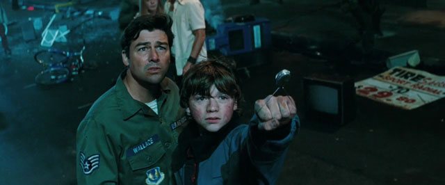 Kid named Joe is helping made a zombie movie with friends, who recruit his crush Alice (Elle Fanning, tiny Cate Blanchett in The Benjamin Buttons). With names like Joe, Alice and their buddy Preston, sometimes it seems like this was written as a 1940’s movie then changed at last minute. Joe’s mom died in a factory accident caused indirectly by Alice’s dad, Joe’s dad (Kyle Chandler of Katy’s football show) is the town cop, Charles (the super-8 director) has a thing for Alice – these are our token character details, the Stand By Me half of the big-budget action movie. Seems that a vindictive alien escaped from gov’t captivity when Turman drove his pickup truck onto train tracks causing an outrageously overdone crash, which throws train cars into the air like in a Transformers flick but doesn’t kill Turman or fully destroy his truck. Shadowy gov’t agent Nelec will finish the poor guy off before being dispatched by the alien, who proceeds to loot the area of all wiring, engines and other metal bits to construct a vessel home, finally turning the town water tower into a Katamari Damacy electro-magnet.