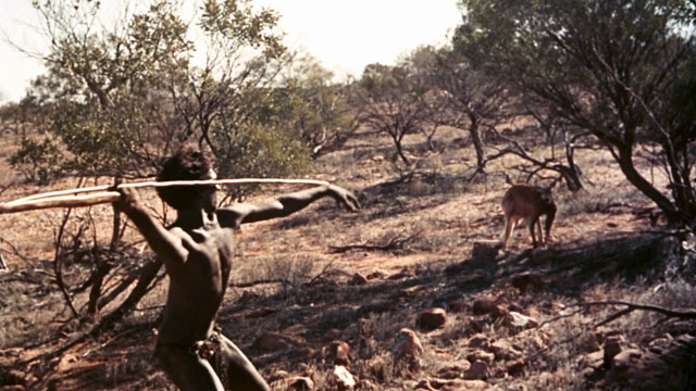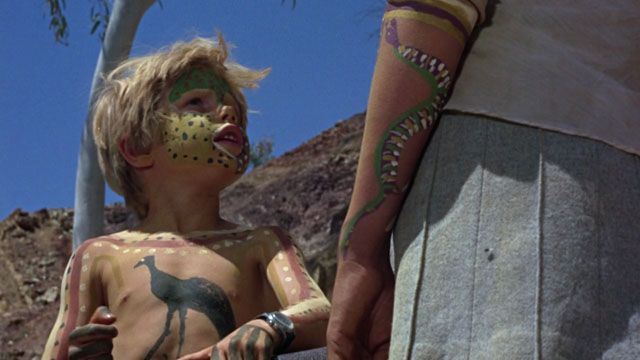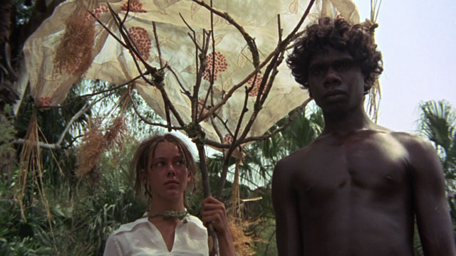Much has been written about the “fragmented” style that Roeg has employed in so many of his films — Don’t Look Now, The Man Who Fell to Earth, and Bad Timing all play with linear narrative, setting subtle traps for the viewer and commanding our close attention. In Walkabout, this style serves to enhance the sense of memory that pervades the film. All coming-of-age stories are fundamentally memory stories, rooted in recollections of a time of great intensity, of growing, of puzzling, of understanding. We look back at that stage in our life and find memories of the pain we felt and the pain we inflicted, unthinkingly, because we did not understand ourselves and our burgeoning relationship to a new, strange adult world. The strangeness of that world for the girl in Walkabout is deepened by the landscape; for the aboriginal boy, it is deepened by his encounter with people for whom his lifelong training has ill prepared him.