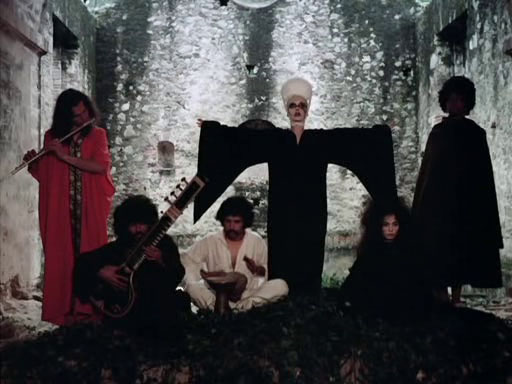 White-hatted Gaston is visiting Dr. Maillard’s psychiatric hospital when they’re met at the gate by a loony-acting guard, and I suddenly realized this was based on the same Poe story as Svankmajer’s Sileni, and is going to suffer in comparison. Gaston is welcomed into the asylum, led by the swirly-robed man on the DVD cover, while his red-hatted friend (Martin LaSalle, star of Pickpocket) is attacked in the woods and his woman raped. It just isn’t a bad 1970’s movie unless a woman gets raped.