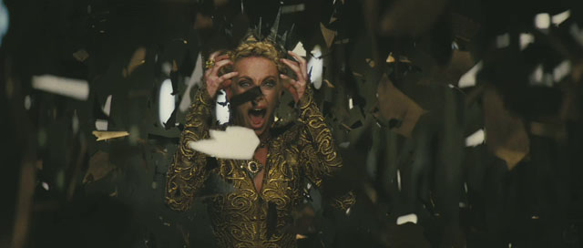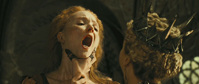 After Charlize takes over the kingdom and kills all flowers and happiness, the imprisoned princess grows up to be Twilight Stewart and realizes there might be trouble in the kingdom when her cellmate Lily Cole leaves to see the queen and returns as an old hag, so Twilight escapes by slashing Theron’s albino brother Sam Spruell in the face. She meets her reluctant protector Thor Hemsworth and they go adventuring, collecting the exiled Duke’s army and the all-important dwarfs to help.