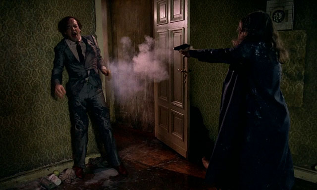 But then! Neill hires a private eye (who is terribly obvious when tailing people) to follow his wife and it turns out she’s staying in a third apartment, a place Heinrich doesn’t know about, and he spins bouncing off the walls when he finds out. Investigating further (by walking right in), the detective is killed by a psychic demon, followed a few scenes later by his partner (huh, a sympathetic gay character in 1981). Yes, Adjani is cheating on both men with a Scanner tentacle-demon, and there’s a pod-person connection when Neill meets his son’s schoolteacher who is the spitting image of his wife but with green glowing eyes.