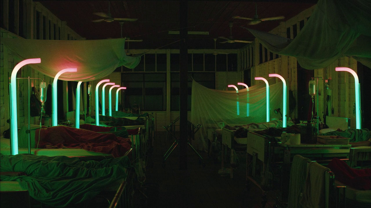 In a stunning act of political avant-gardism, Joe has adapted Thai Buddhist tenets regarding reincarnation as a means for excavating the hidden history of a troubled landscape. As his camera slowly creeps and pans through darkened, abandoned homes, Apichatpong is displaying the remnants of a repressed past, in an assertion of ghostly, vertical time. … Joe’s dominant visual cue throughout Boonmee is the depiction of dark, illegible interiors whose porous walls and broken-out windows allow the bright green of the jungle to puncture the once-domestic space with light and texture. As beautiful as the effect may be, it is also chilling, since it represents the breakdown of human effort’s separation from natural encroachment, the dissolution of basic boundaries.