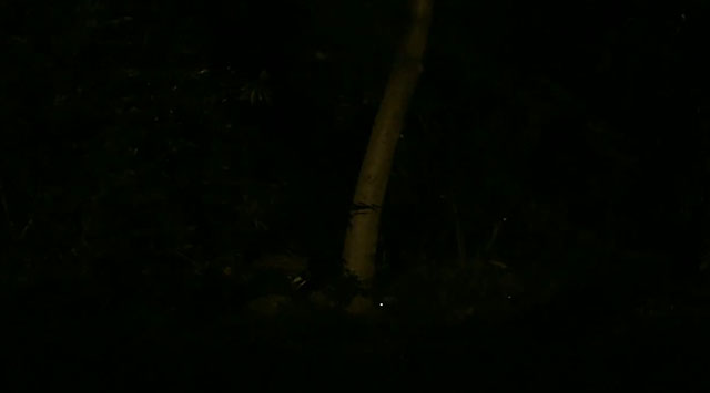 Static shot of – what’s that, a tree? – with audio of thunderstorm and constant firefly flicker.