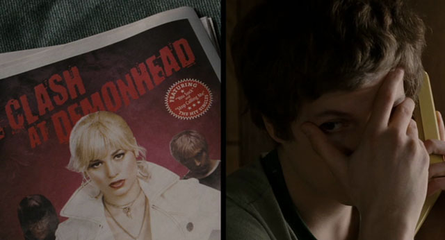 Opens with a great replacement-title gag, then there’s some editing humor and surface noise, and another “missing reel” right when something sexy’s about to happen, but then QT chills out with the self-reflexive filmmaking gags as his movie gets darker.