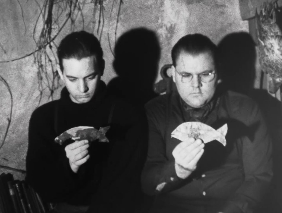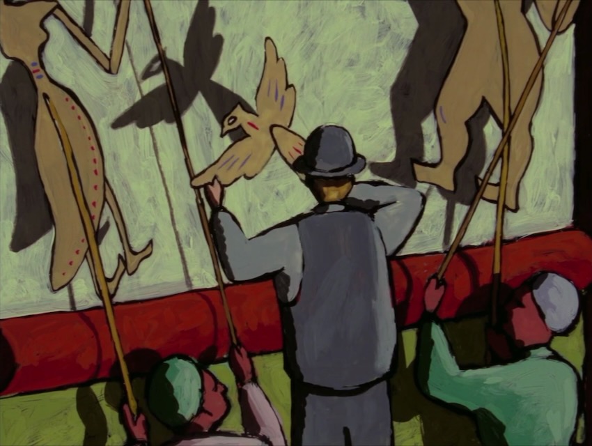 Swirling dizzy blobby animation. The man has a shadow from the start, so I wasn’t surprised when he sells it to a devil in exchange for the promise of riches and women. But I was surprised when, after women want nothing to do with a shadowless man, he gets a pair of red boots that enable him to leap across the earth, checks out different gatherings, and settles on a shadow theater where he can manipulate the puppets shadowlessly without using rods or strings.