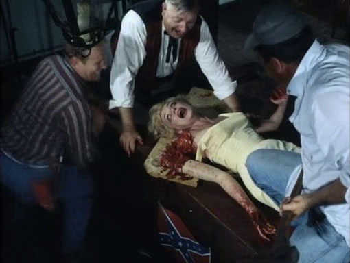 “The South’s gonna rise again,” says the corny-ass song over the introduction, and that’s just what the movie’s about. Some lost travelers on their way to Atlanta get redirected to a rural town and crowned the guests of honor in a Civil War revenge ceremony, killed in various inventive ways, usually in broad daylight before a crowd of cheering townies. One is crushed by a giant rock in a carnival game, another is ripped apart by horses, and in the most famous scene (to my dad, anyway) a guy is put inside a barrel full of nails and rolled down a hill. Twist ending: the couple who escapes returns with law enforcement, but the town has vanished, leaving only a plaque saying that the whole place was leveled by the Union army during the war (apparently inspired by Brigadoon, if “inspired” is the word).
