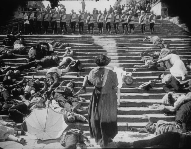 Due to unrest over spoiled food, the ship’s captain decides to hang a bunch of crew members – a bad move, since the others have been simmering rage againt their superiors, and choose this moment to mutiny, their leader Vakulinchuk shouting “brothers!” as a rally cry – a shout that will be repeated at the end, when the other battleships descending on Potemkin, presumably to quash the rebellion, choose to join it instead. Before that, the State is shown as brutally repressive, mowing down innocent civilians (children! mothers!) pitilessly on the steps of Odessa, where the ship lands and becomes a heroic symbol to the locals.