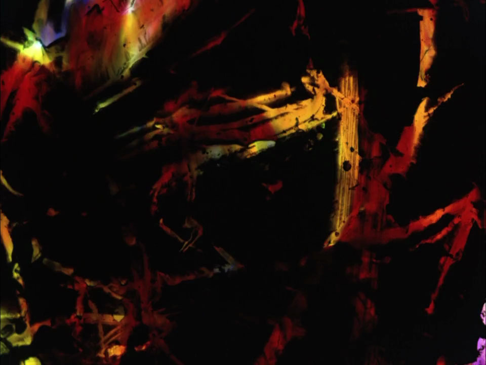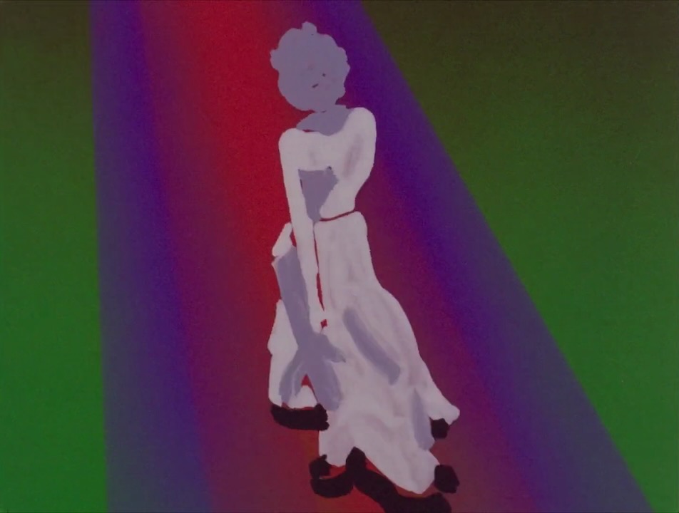 The figure returns home, tumbles through the yard, sees a rainbow in the garden hose spray, just as I did 15 minutes ago. Awesome transition through color fields to the night streets as the camera walks into a bush, as if the night hides inside the shrubbery. With all the quick intercutting to the dark scenes I’m starting to make sense of the title. The music gets amped when a baby is sighted in the grass, filmed in constant motion and way too close, of course.