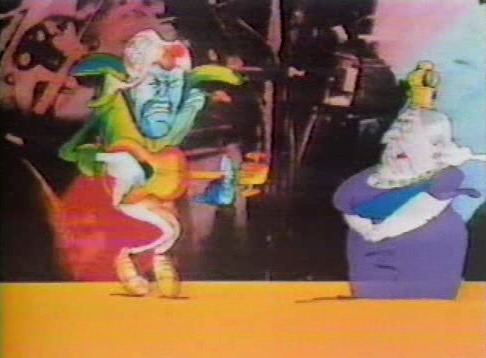 Is the sun rising or has he wheeled a giant lamp into the sleeping kids’ room? I think the latter. Still intercutting to the nighttime trees, and now a bear instead of the bird. Flashing between night and dawn as the music gets more loopy, then firmly into morning, the silhouette person hanging disturbingly from a rope in the tree.
