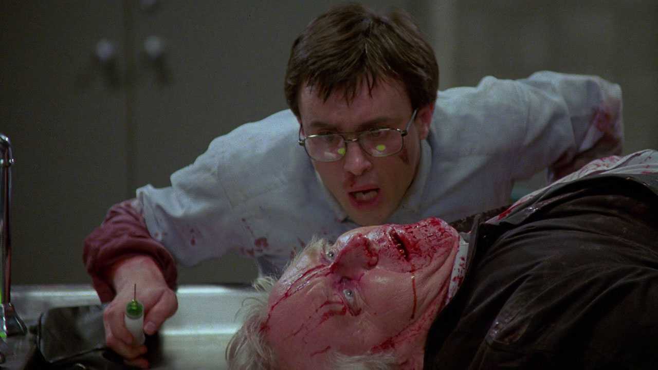 We’ve got medical school dean Halsey, his student daughter Megan, and her boyfriend Dan… then there’s the boyfriend’s eccentric new roommate Herbert, and his archrival, brain surgeon Dr. Hill. Dan and the Dean (horror royalty Robert Sampson of City of the Living Dead and Netherworld) are fine, but the other three… Barbara Crampton, Jeffrey Combs, and David Gale as Hill… if I was in charge, I’d cast them in every movie.