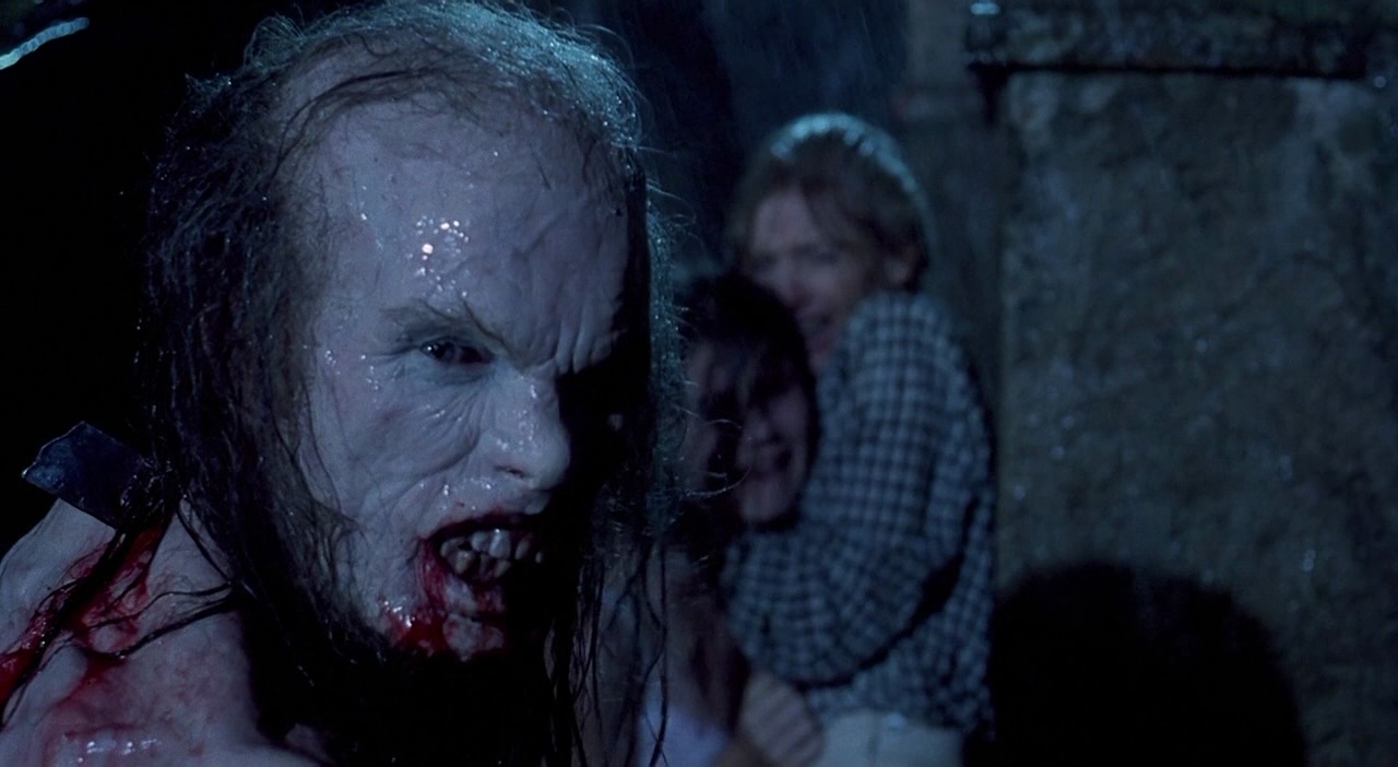 Combs brings home a local hotgirl – she wanders into the castle and gets freaked (it chews her boobs off). Combs is arrested because people are going missing, and you’d think it would help his case that the freak kills two more cops while their suspect is in custody, but Combs still has to conk a cop on the noggin and escape to save his imperiled family and battle the freak to their deaths on a rainy roof.