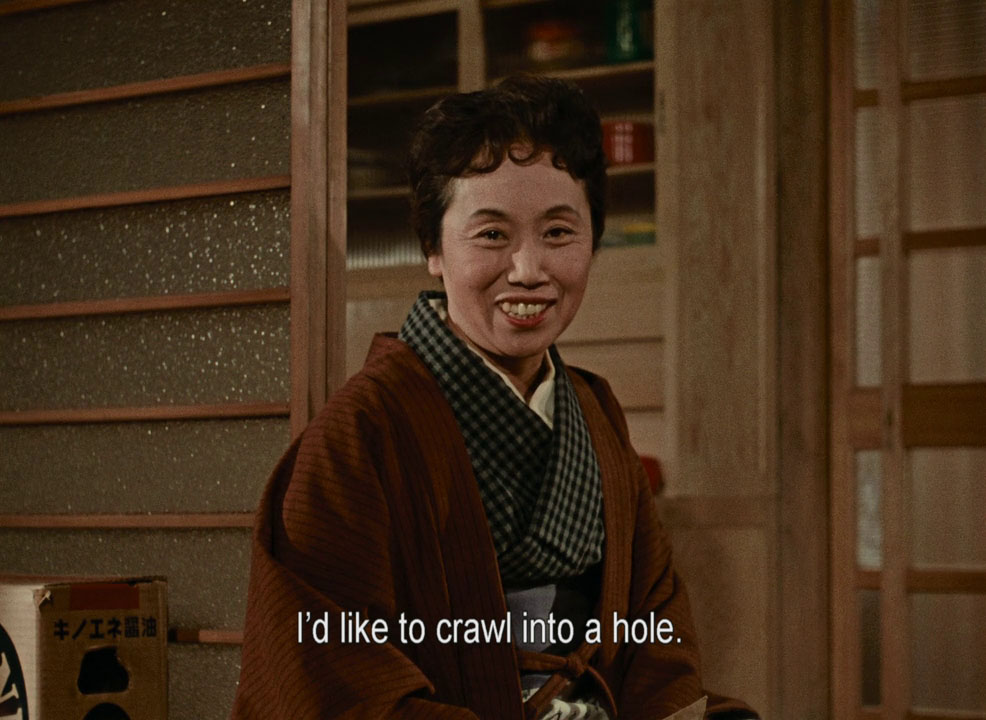 Hirayama’s younger daughter was Miyuki Kuwano, only 16 when this came out, starred in Oshima’s Naked Youth two years later. The family’s giant-mouthed friend from Osaka with health problems, Cheiko Naniwa, appeared in Mizoguchi’s The Crucified Woman. Hirayama’s good friend (whose daughter leaves home and marries against his will, working at a bar which Hirayama visits) is the great Yoshiko Kuga, main guy from Tokyo Story and everything else, appearing in 180 films, 32 of them by Ozu.